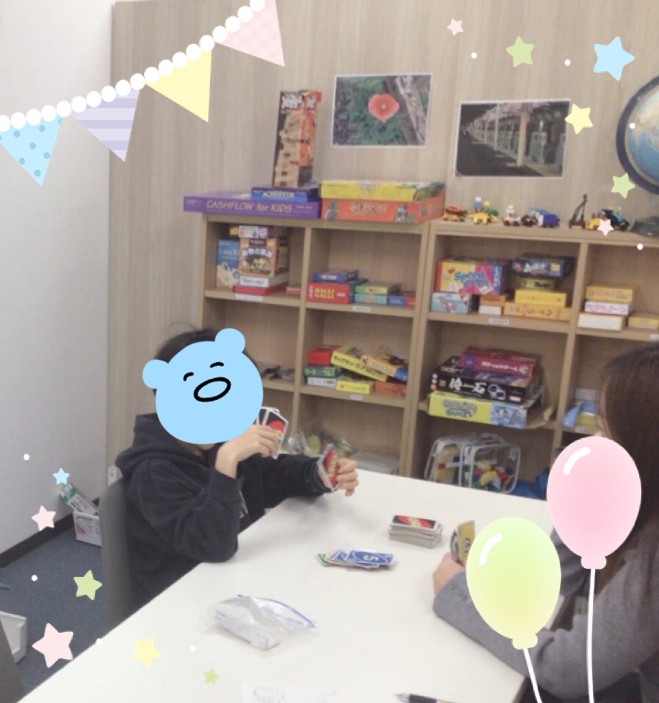 最初は少しドキドキしている様子でしたが、グループワークでUNOを始めると少しずつ笑顔が見られるようになりました。
