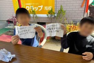 入っていたミッションは・・・「職員と一緒に腕立て伏せ5回!!」と、体育会系なミッションもあります。他にもユニークなミッションもありました。菅谷児発管の肩たたき券、先生の眼鏡拭き100回などなど(笑)お子様達も「えーっ」と言いながらもとても楽しそうにミッションを行いました。