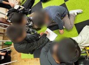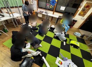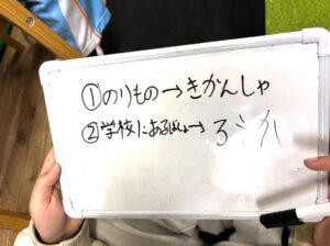 この問題では、①乗り物 ➁学校にある場所の言葉を考えていきます。お子様達で話合い、言葉を組み替え、[①き・か・ん・しゃ、➁ろ・う・か]などの回答がありました。皆様とても楽しそうに参加されておられます。