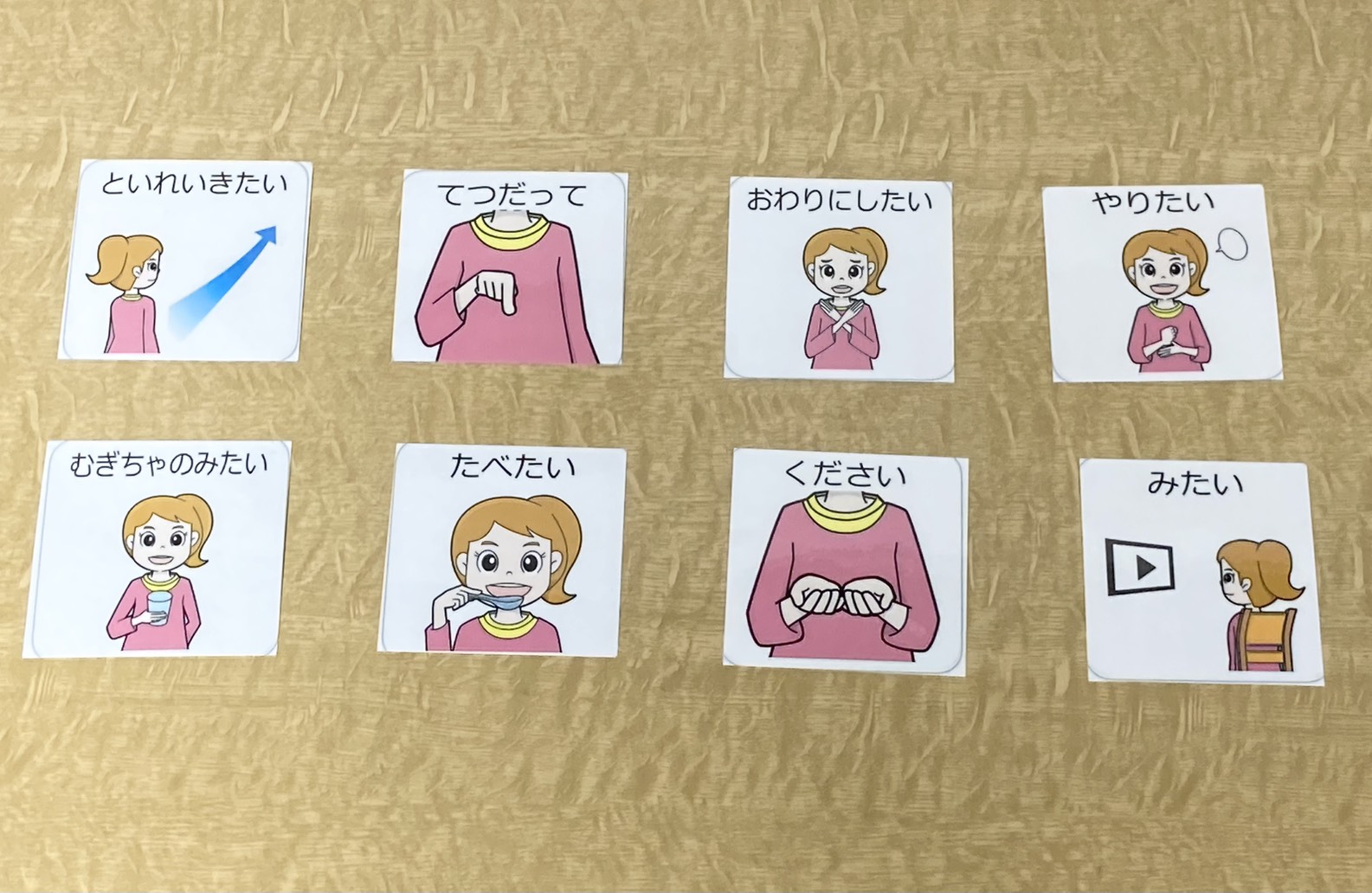「トイレに行きたい」「手伝ってほしい」「終わりにしたい」など、子どもたちはカードを使って職員に自分の気持ちや希望を伝えます。