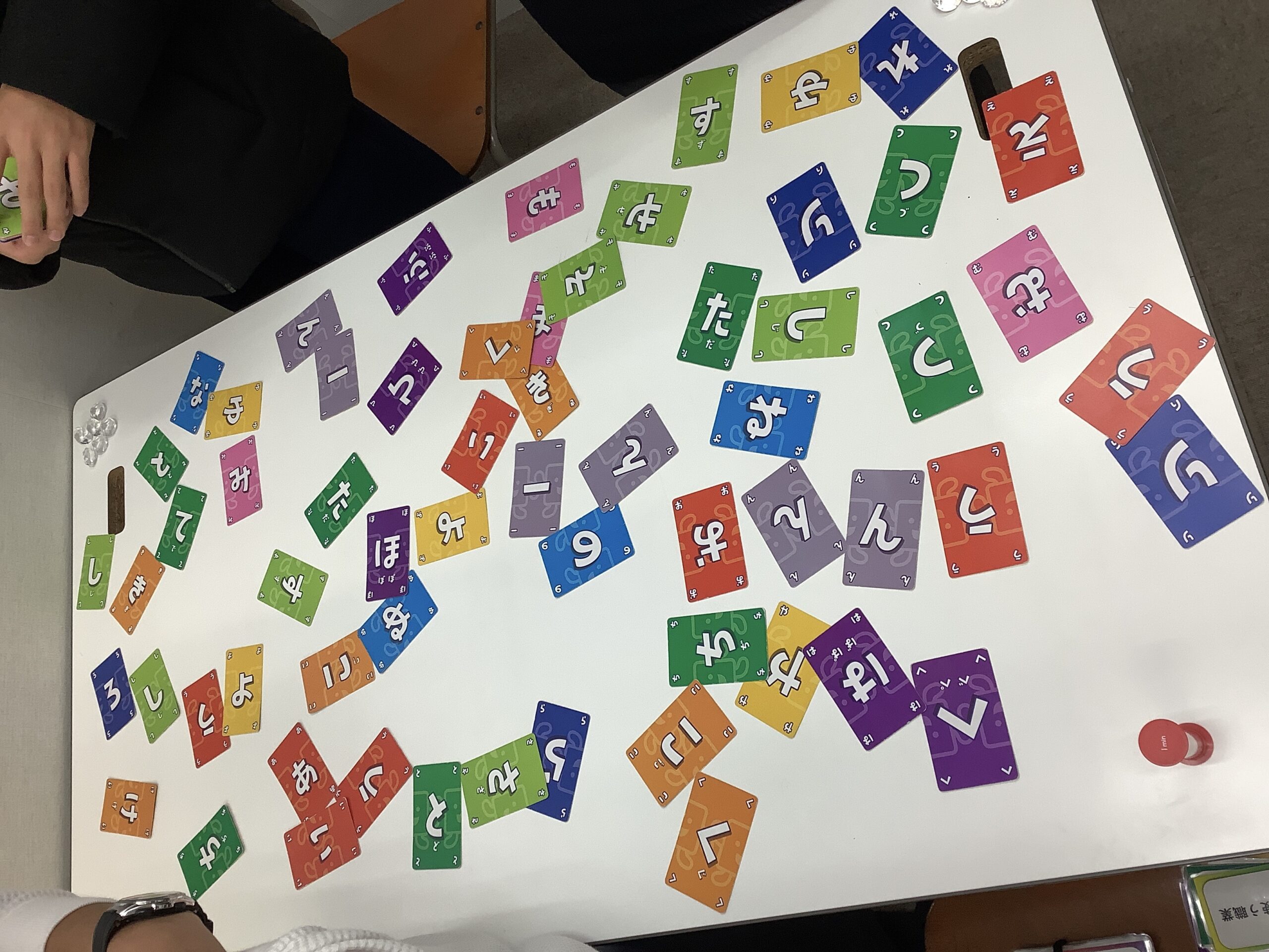 例えば「赤いもの」というお題に「さんた」「いちご」「ぽすと」など、必要な文字を考え探し出し、言葉をつくることができました!