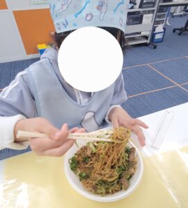 焼きそばは、スタッフと一緒に野菜、お肉、麺を炒めて作ったよ✨