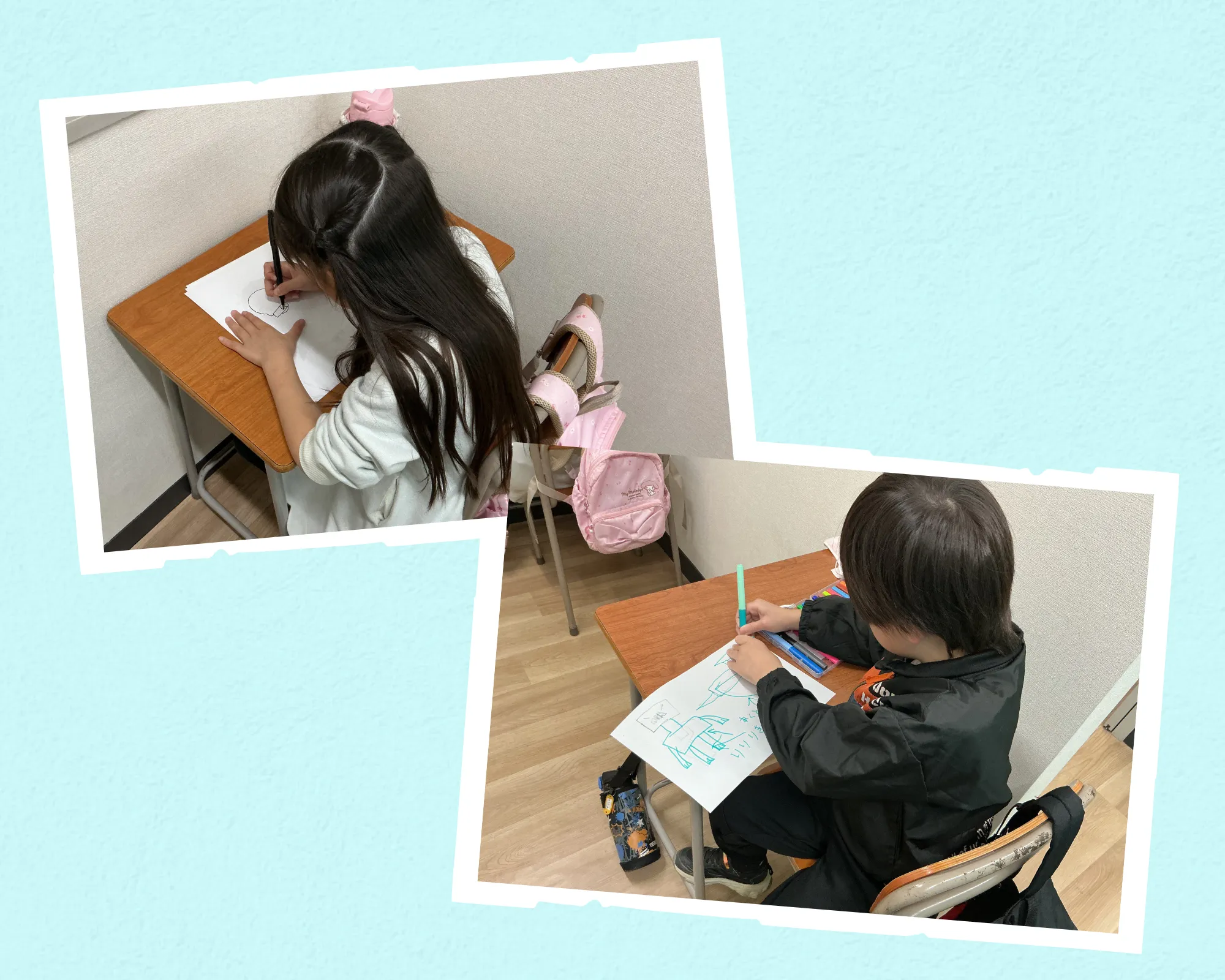 自分の好きなオリジナルの絵を描いたり、ぬり絵を紙の下にひいて写し絵をしたり、様々な方法で絵を描いていました✨